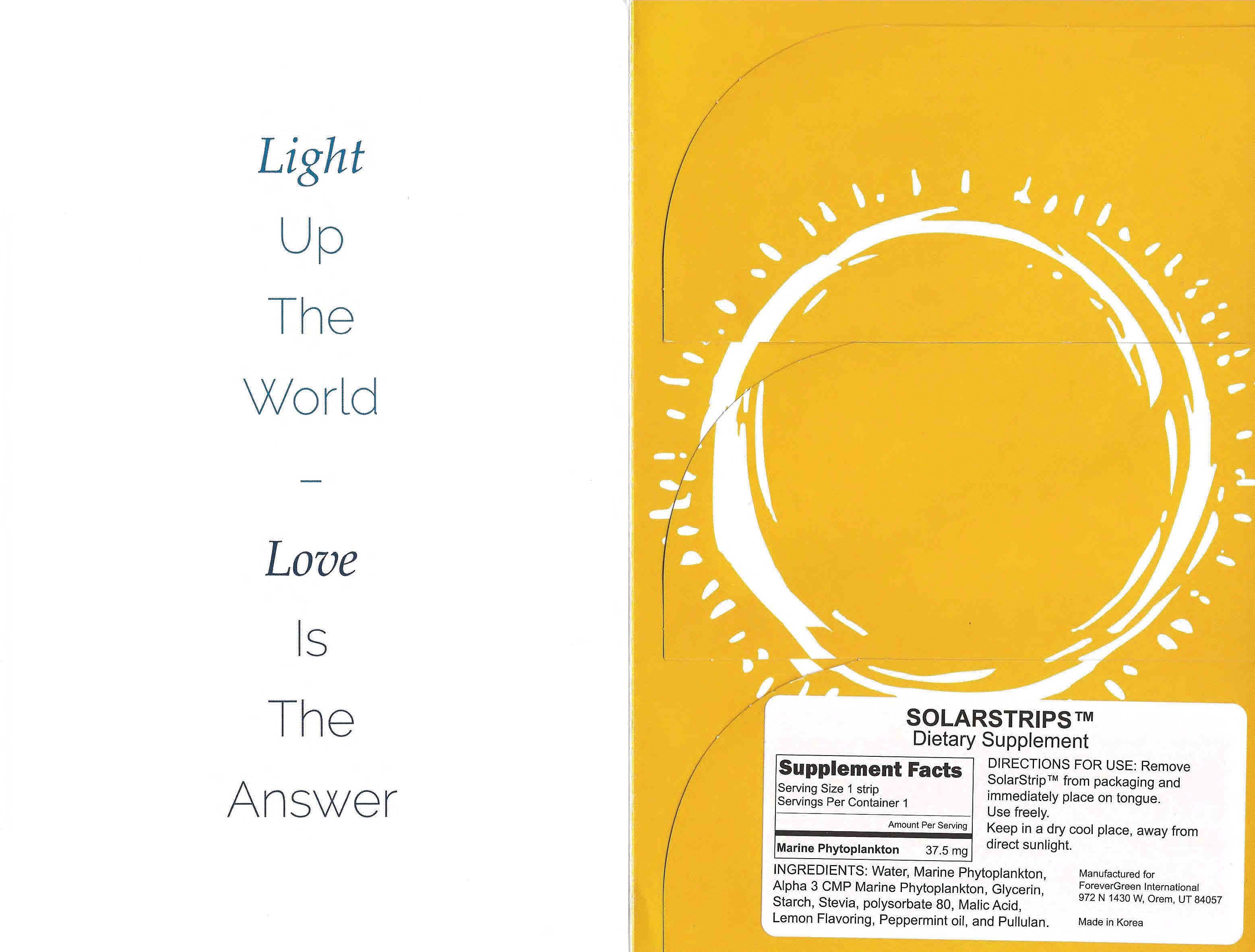SolarStrips™ are a breathtakingly refreshing look at nutrition. Designed to dissolve on the tongue for maximum absorption, 37.5 milligrams of Alpha3 CMP™ marine phytoplankton are packed into each breath-freshening strip.